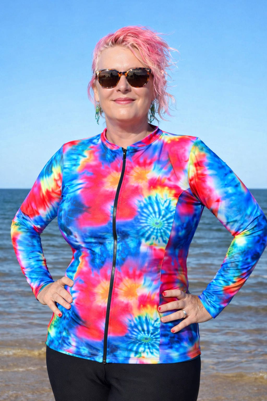 The garment’s cut is tailored to enhance the fuller female figure, slimming the narrow under-bust area to create a beautiful, flattering swim shirt cut. Dressing is simple with the front zip design which allows for quick and easy dressing and undressing, even when wet.